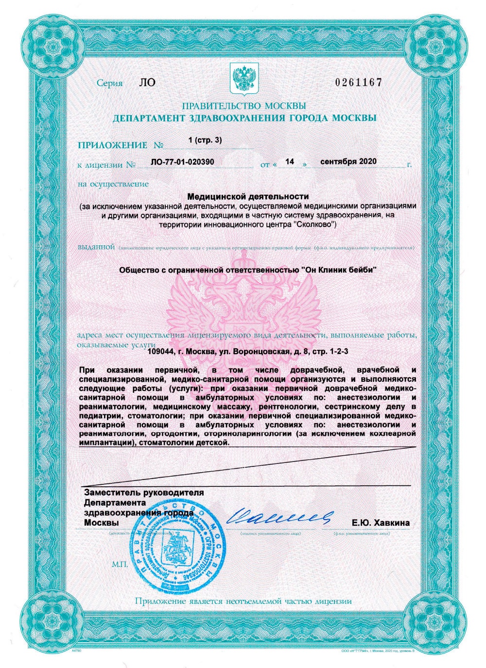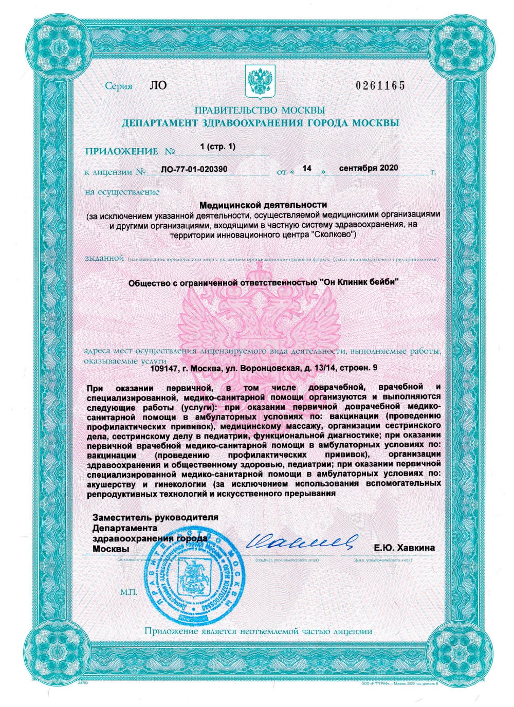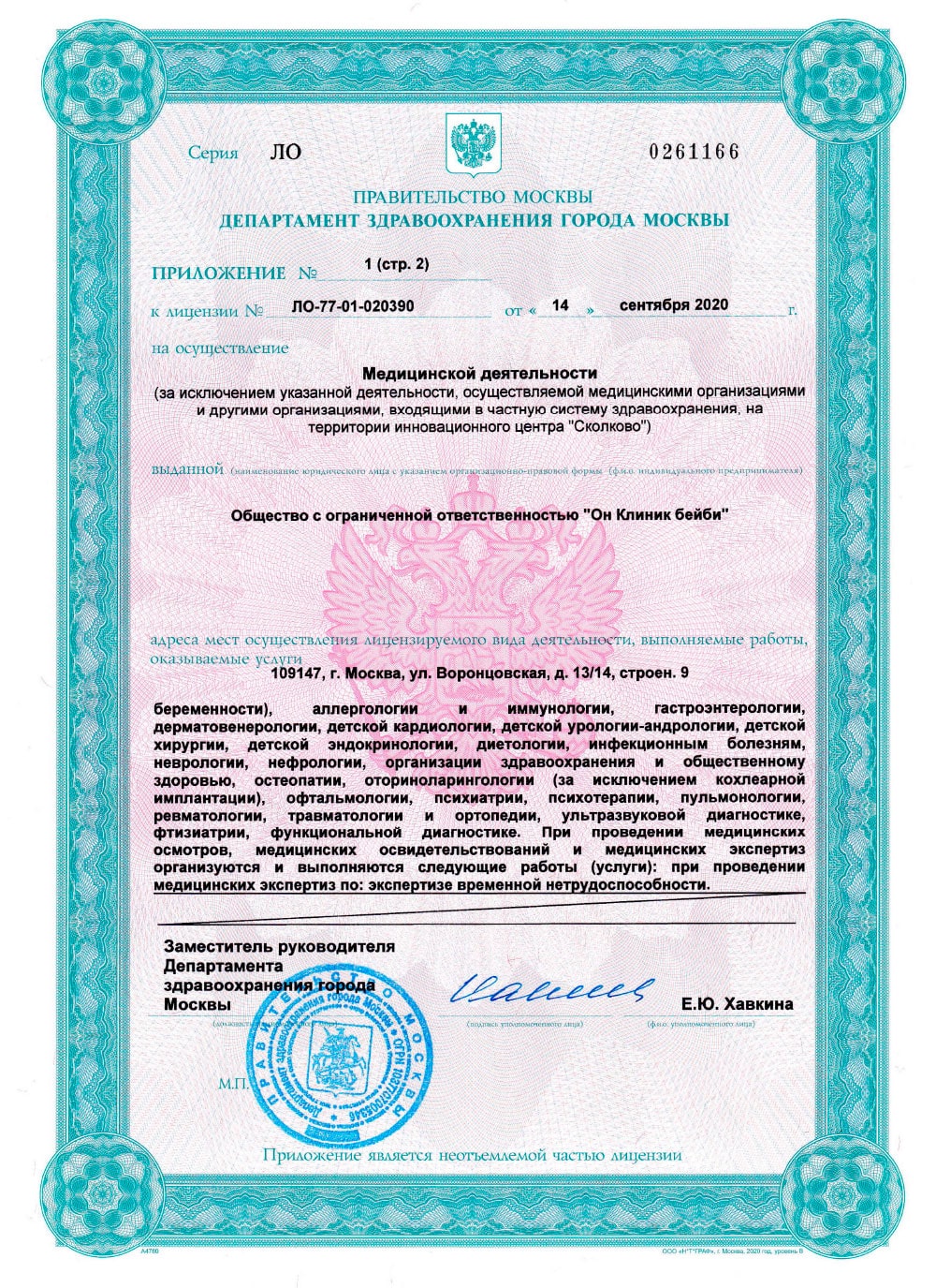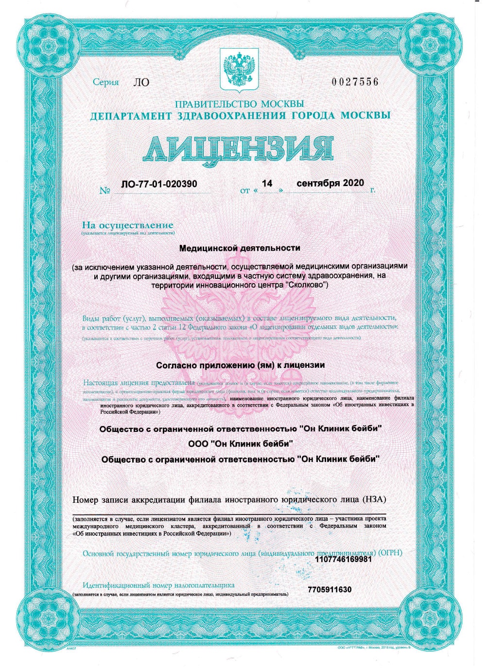 Лицензия ООО «Он Клиник бейби» №ЛО-77-01-020390 от 14.09.20