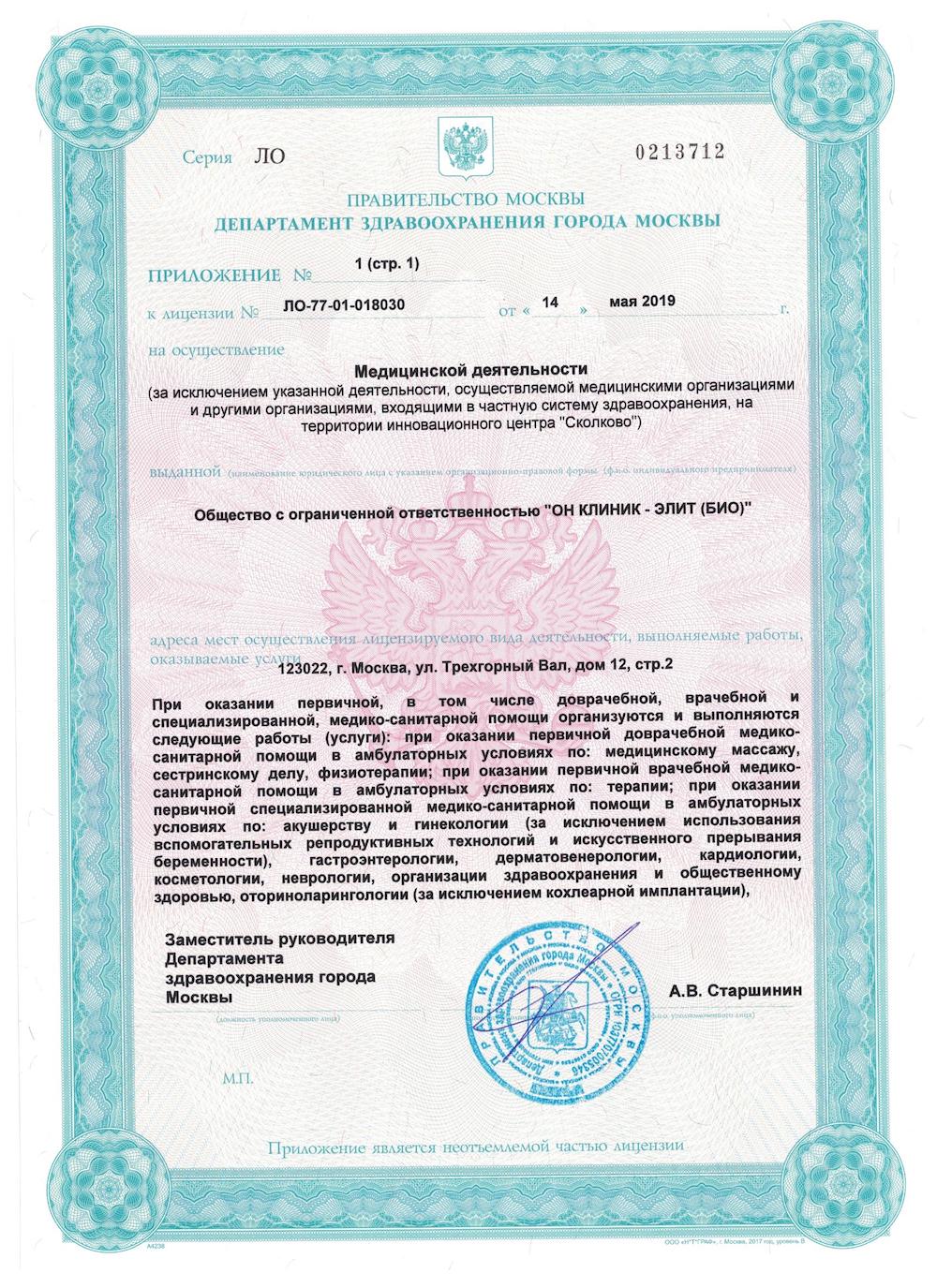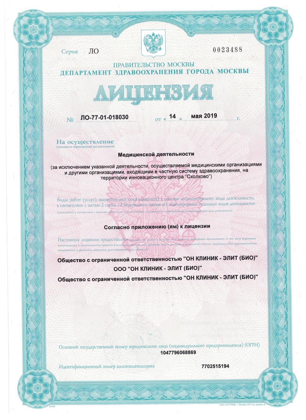Лицензия ООО «ОН КЛИНИК - ЭЛИТ (БИО)» №77-01-018030 от 14.05.19
