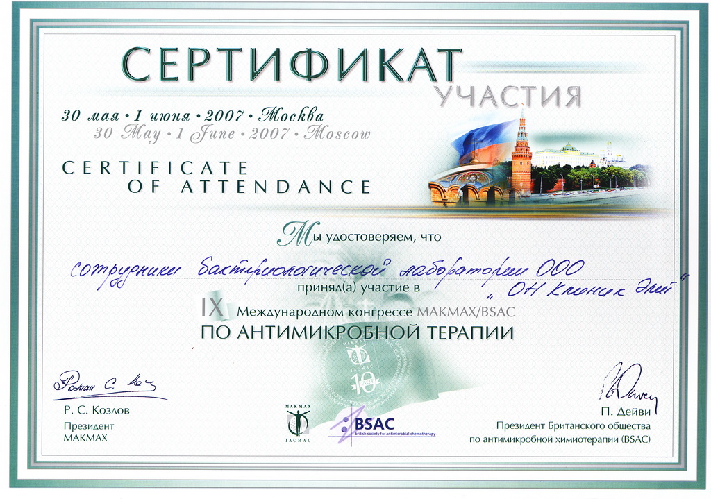 Сертификат участия ООО «Он Клиник-Элит» в Международном конгрессе по антимикробной терапии