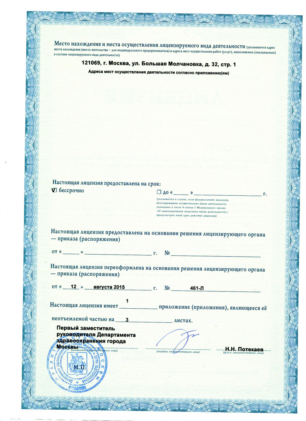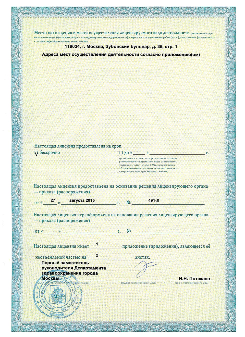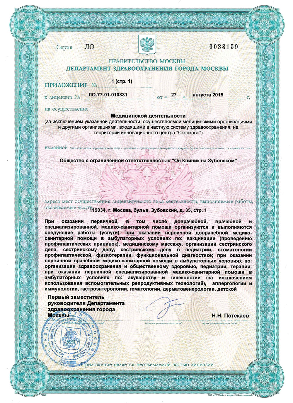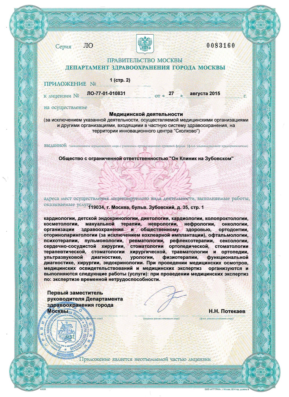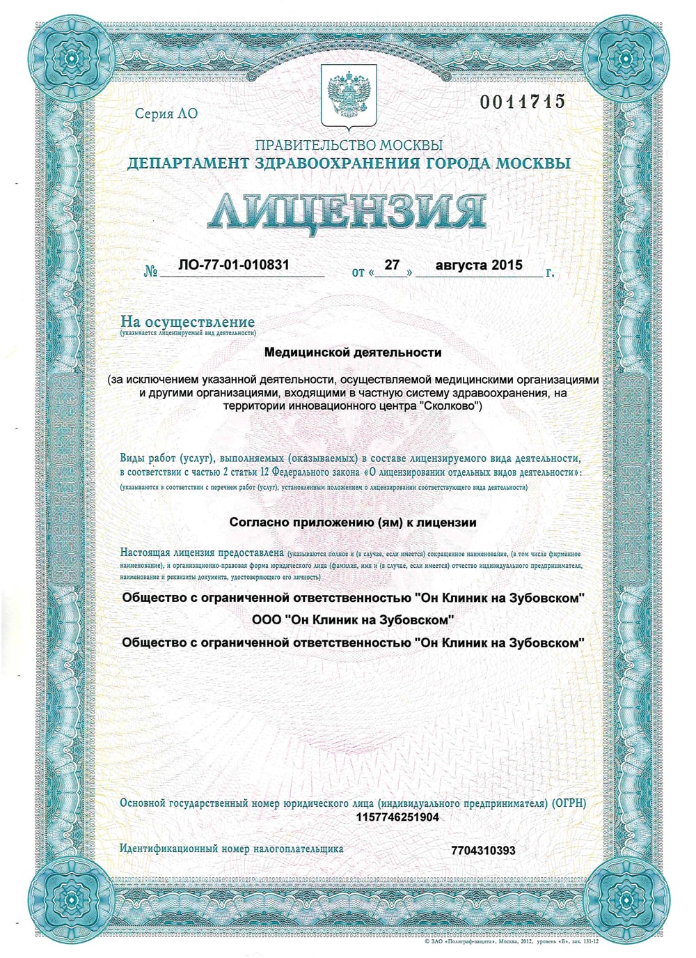 Лицензия «Он Клиник на Зубовском» №ЛО-77-01-010831 от 27.08.15