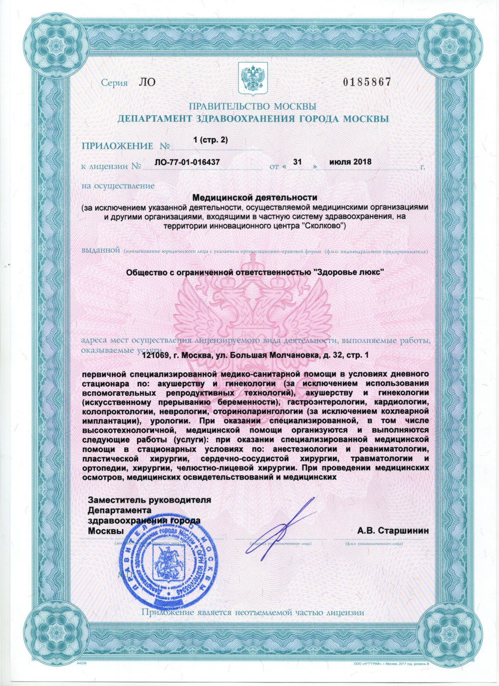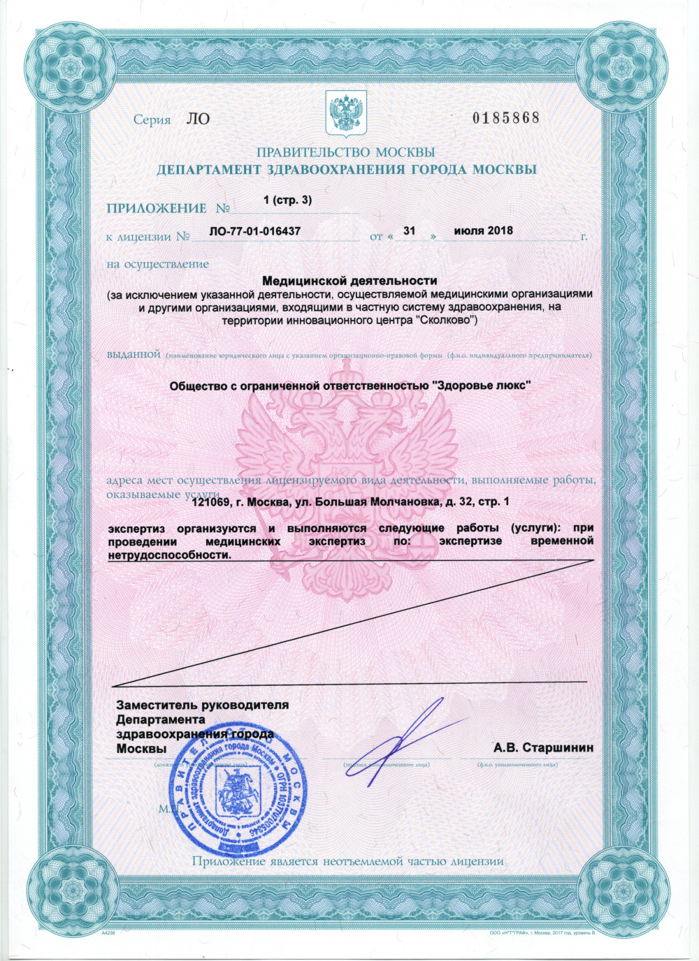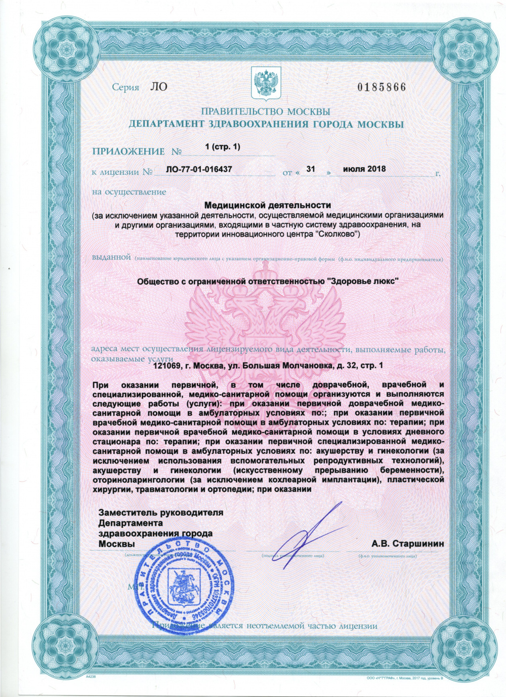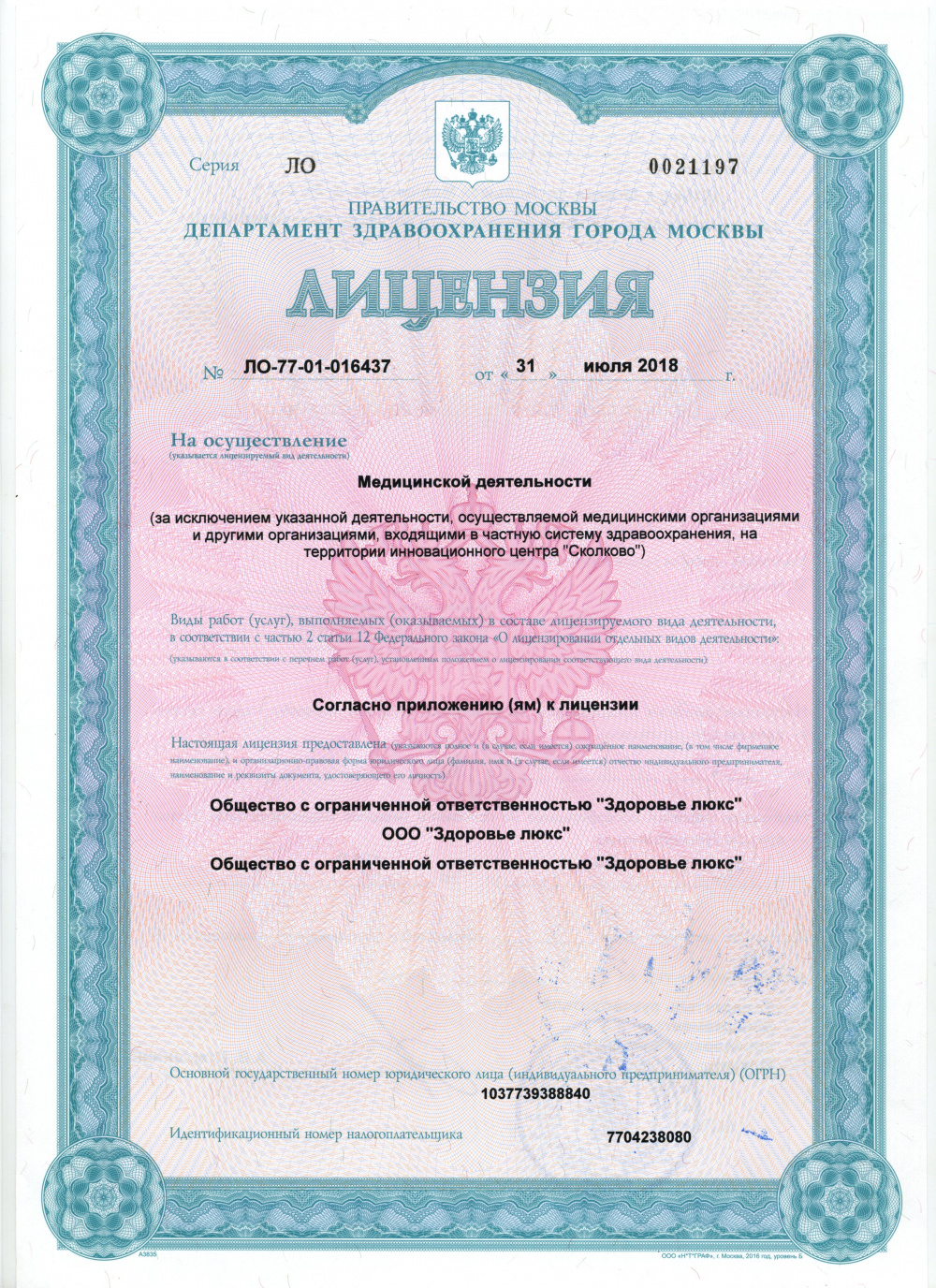 Лицензия ООО "Здоровье люкс" №ЛО-77-01-016437 от 31.07.18