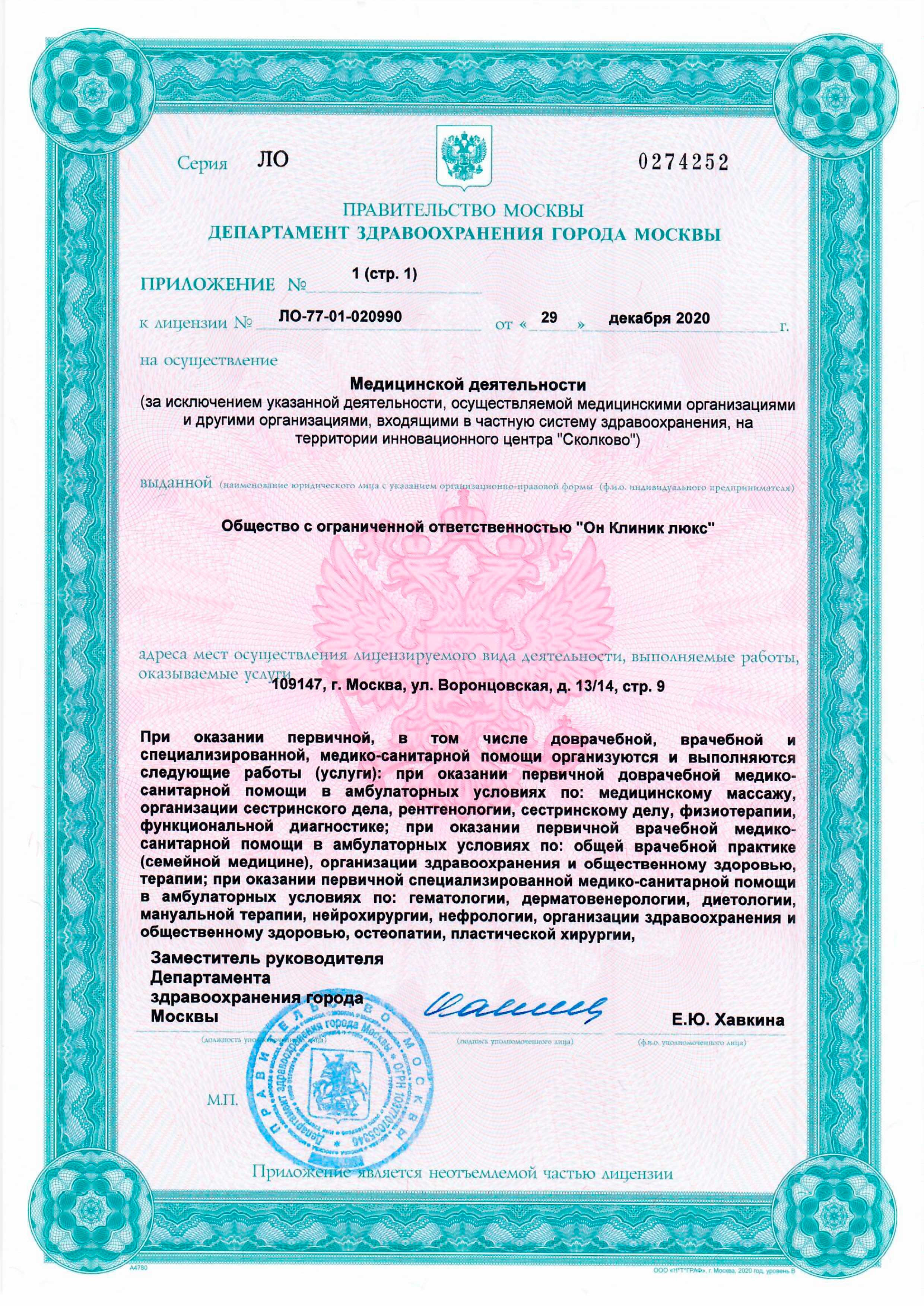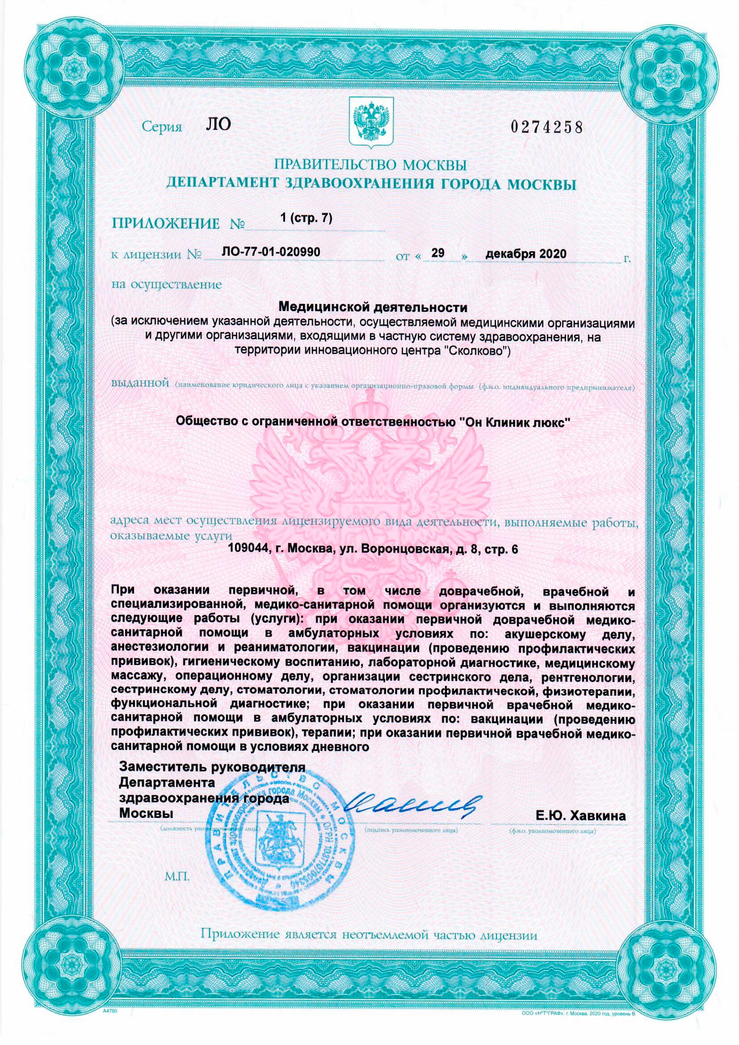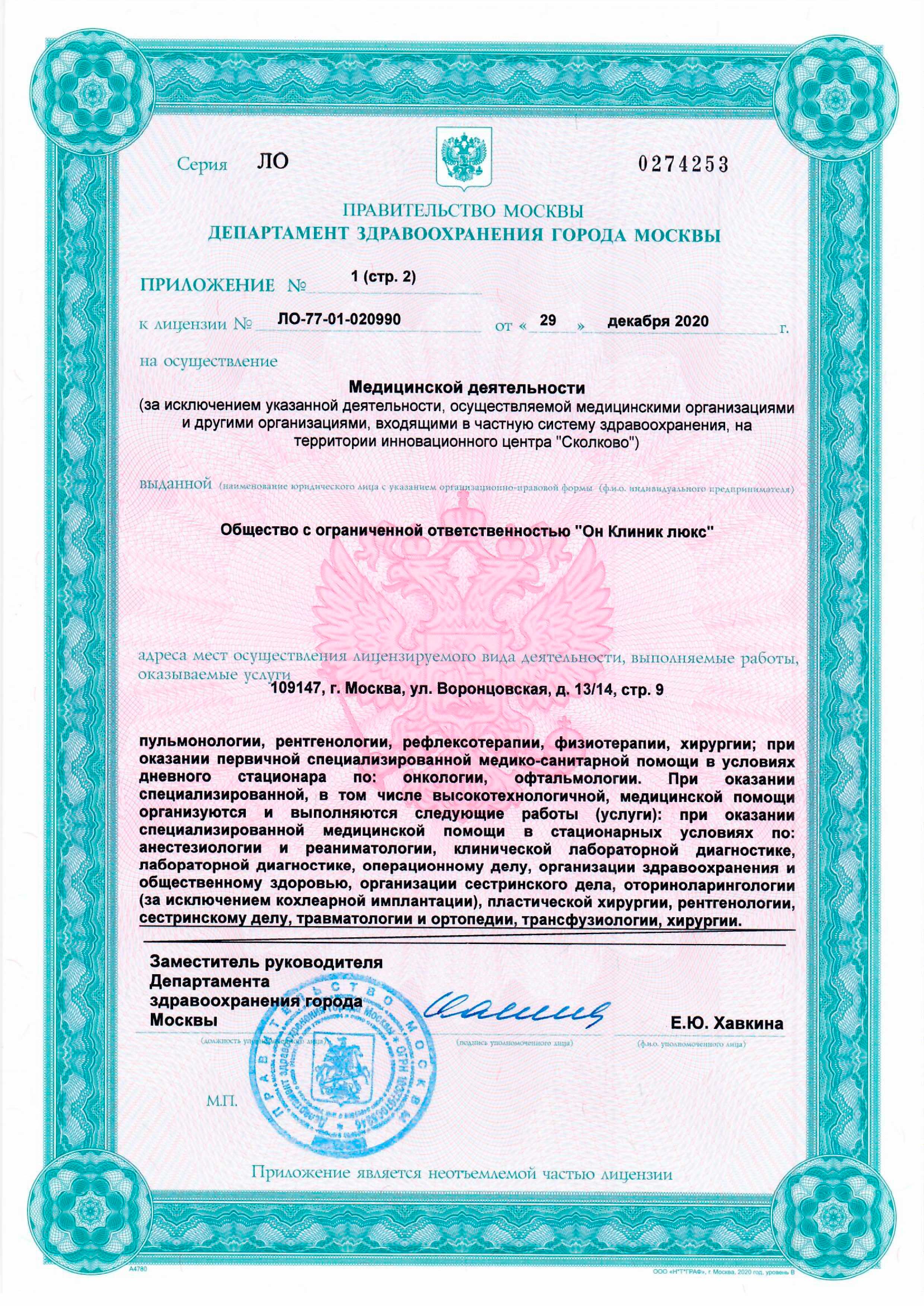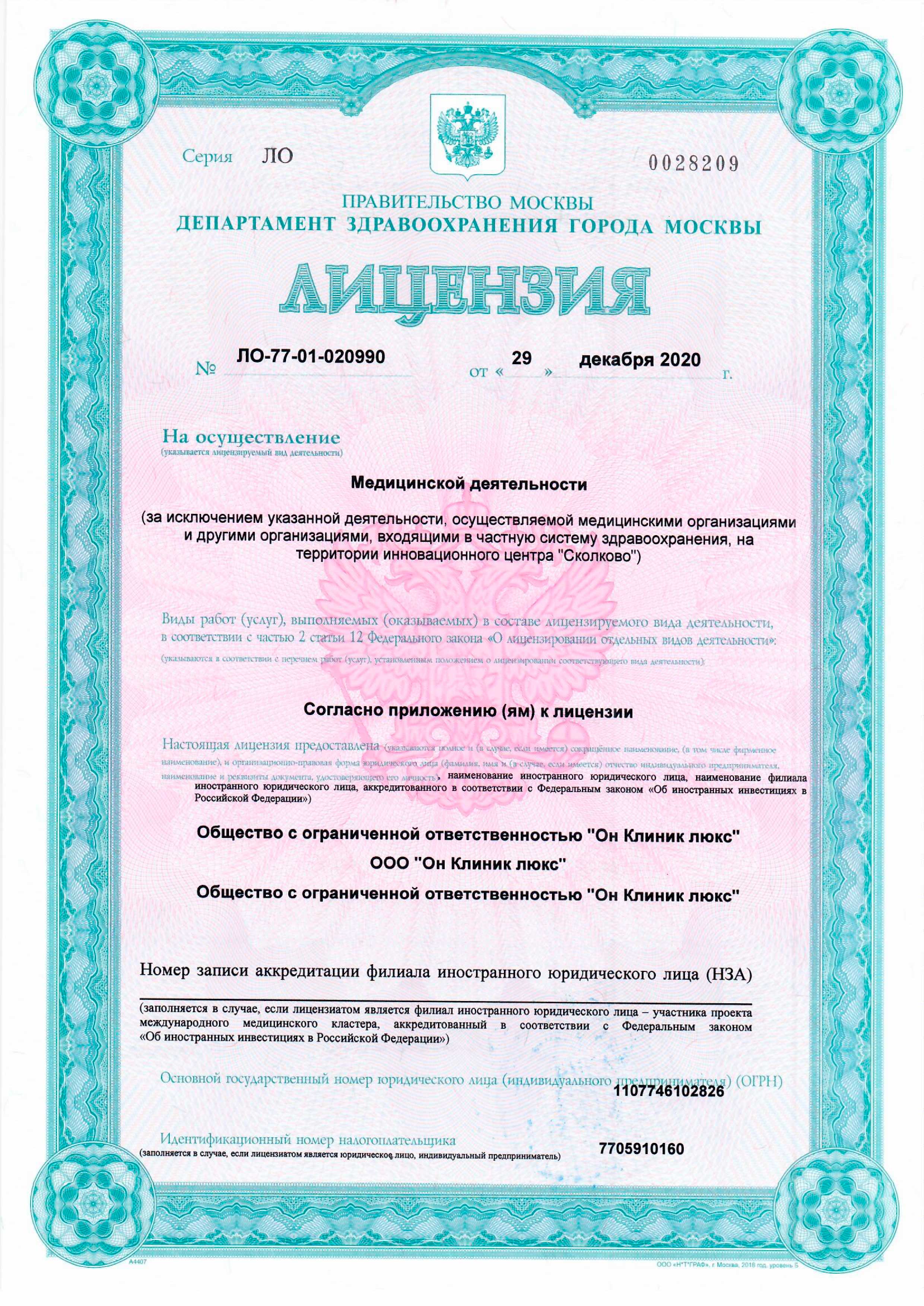 Лицензия ООО "Он Клиник люкс" ЛО-77-01-020990 от 29.12.20