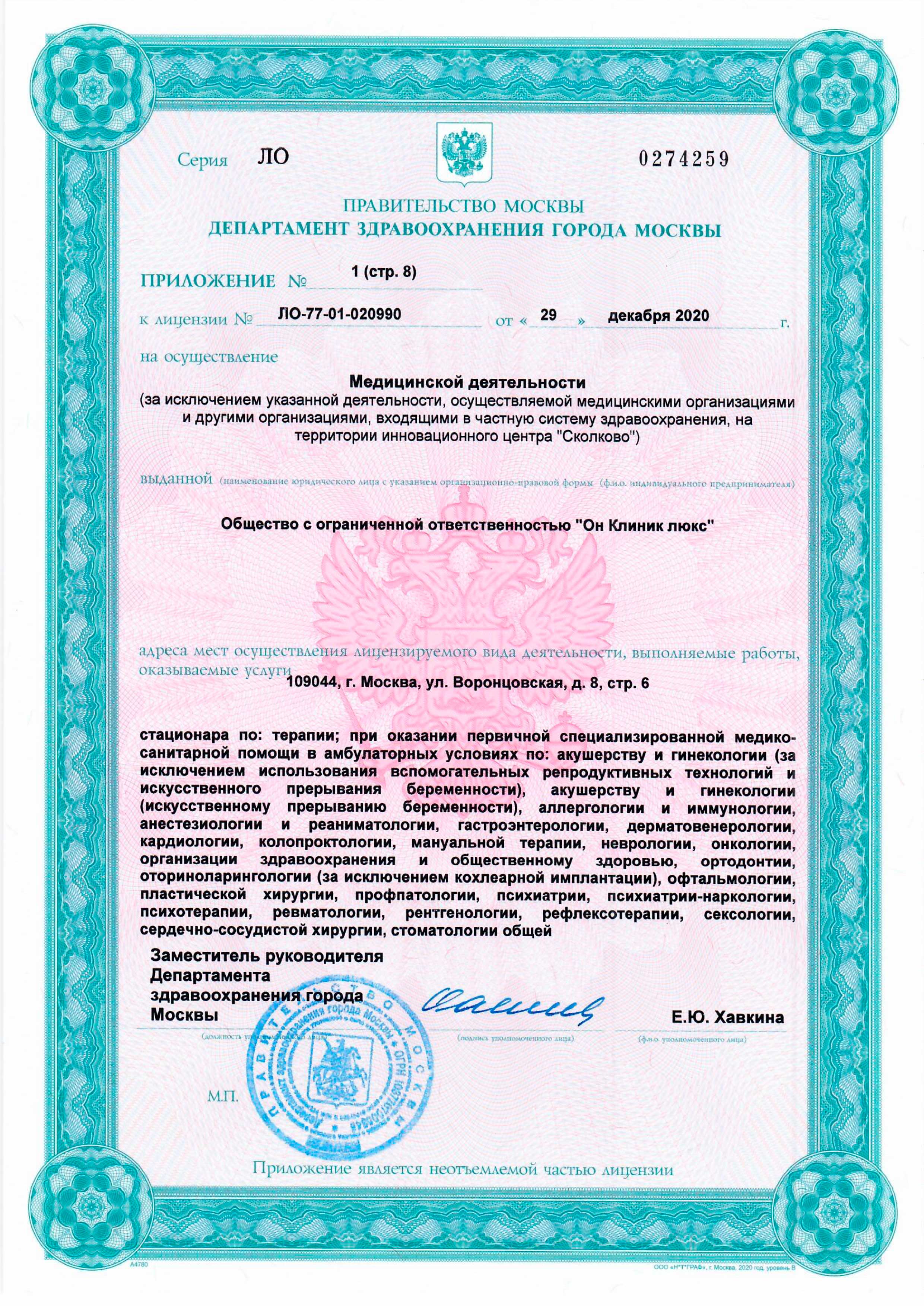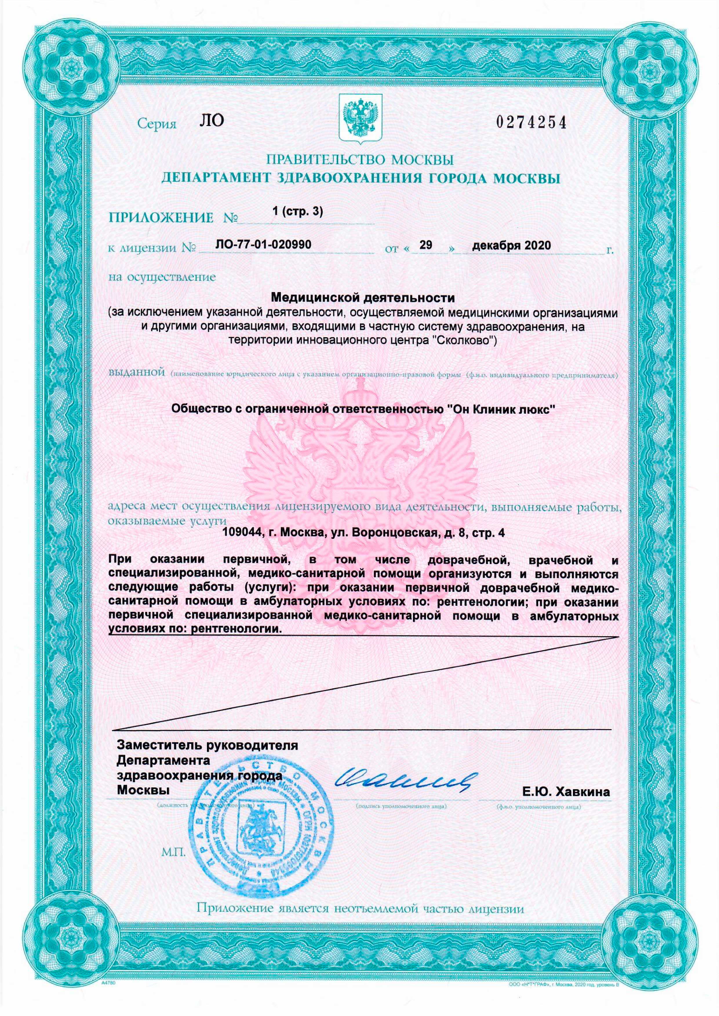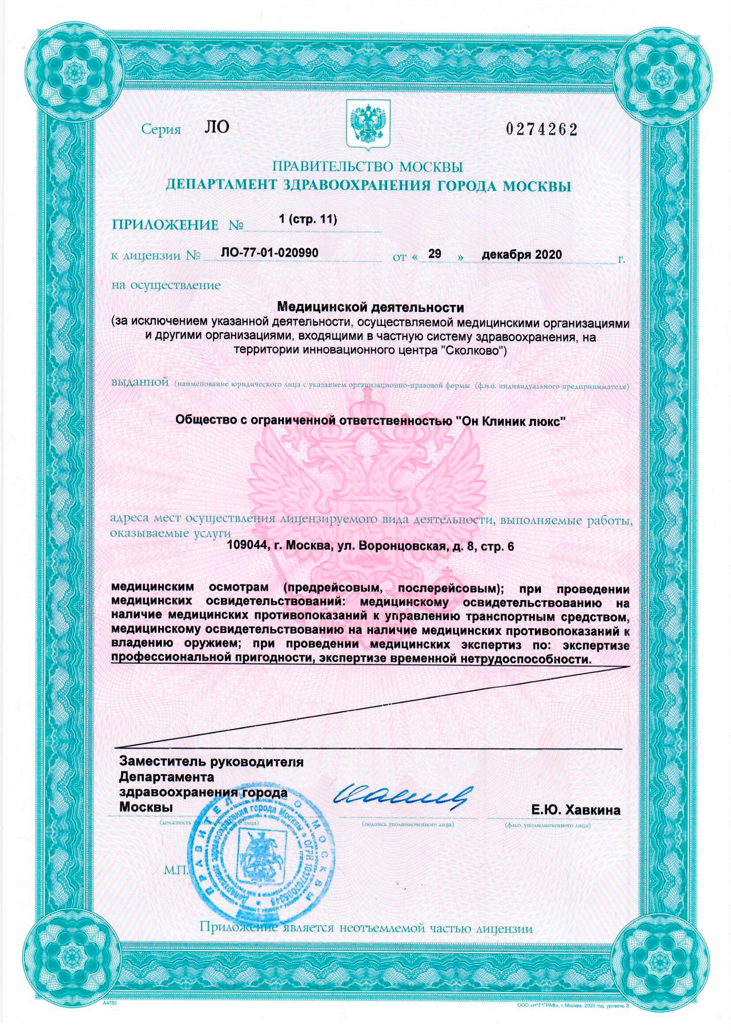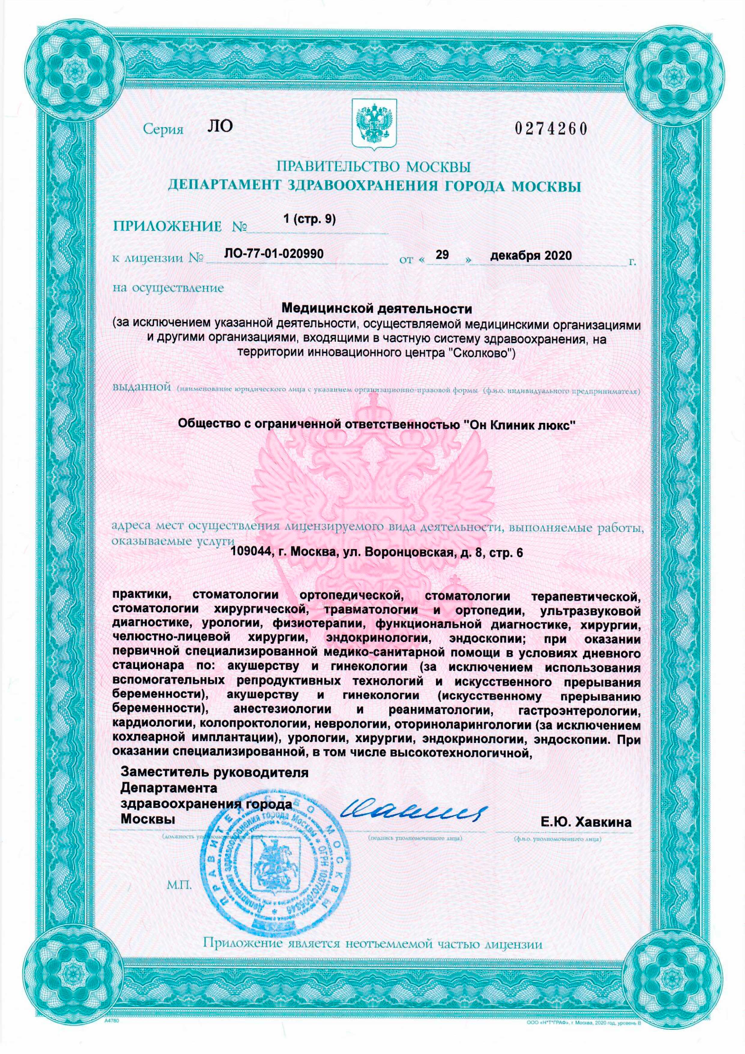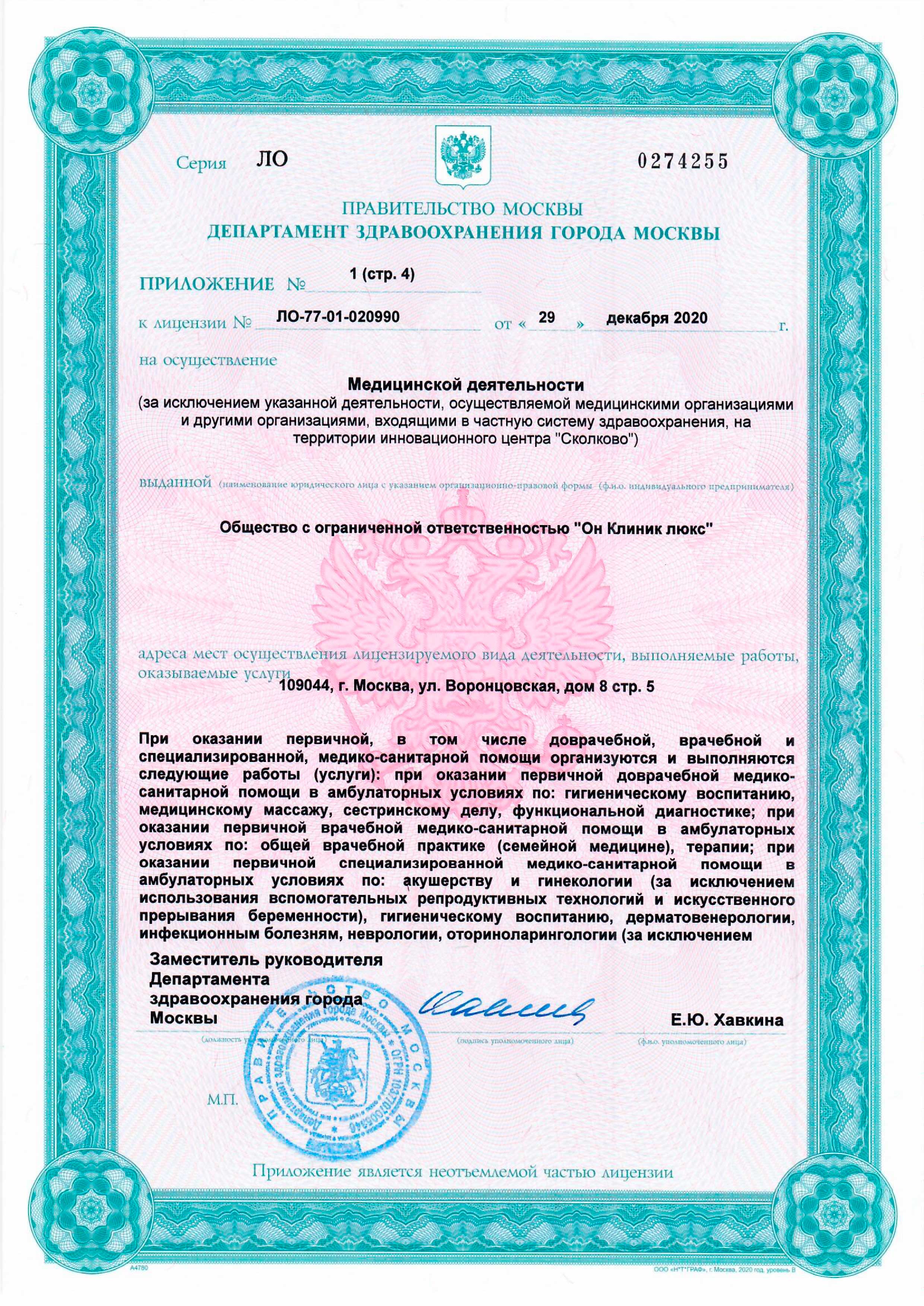 Лицензия ООО "Он Клиник люкс" ЛО-77-01-020990 от 29.12.20