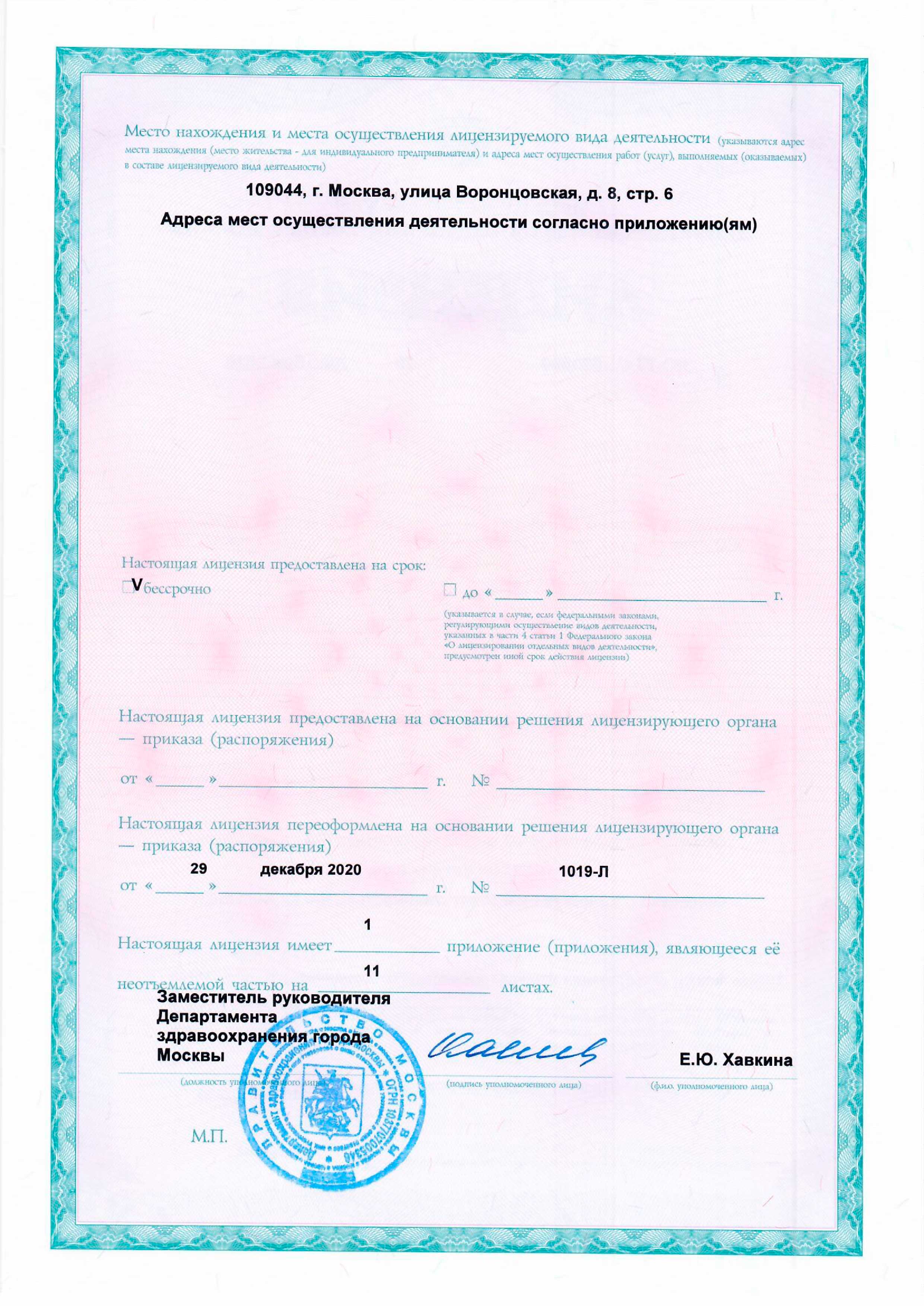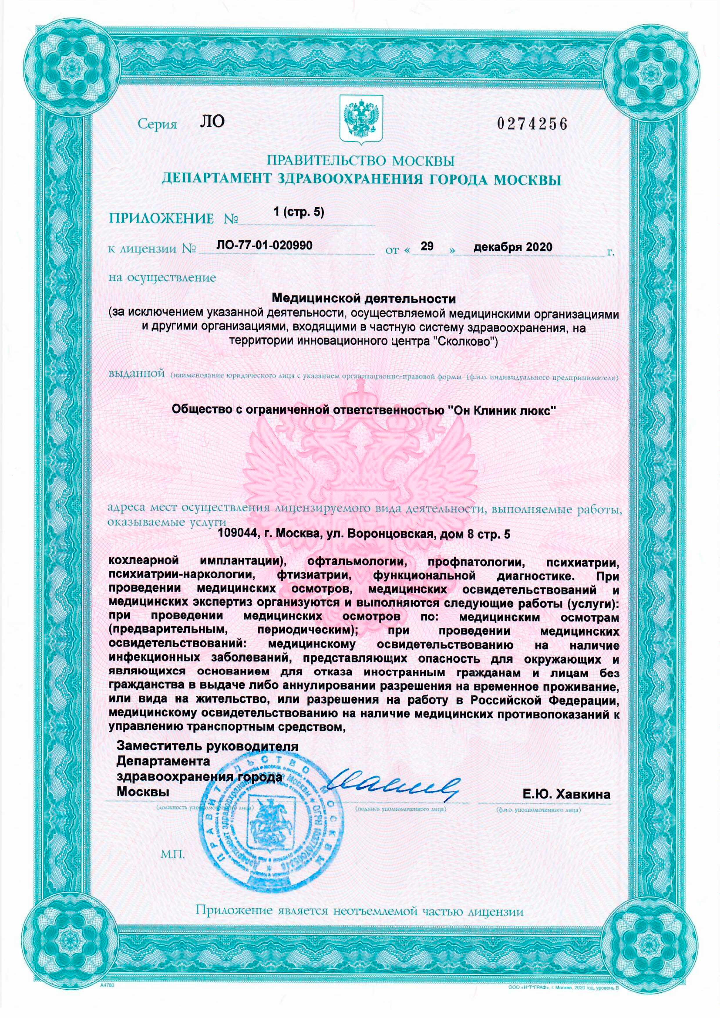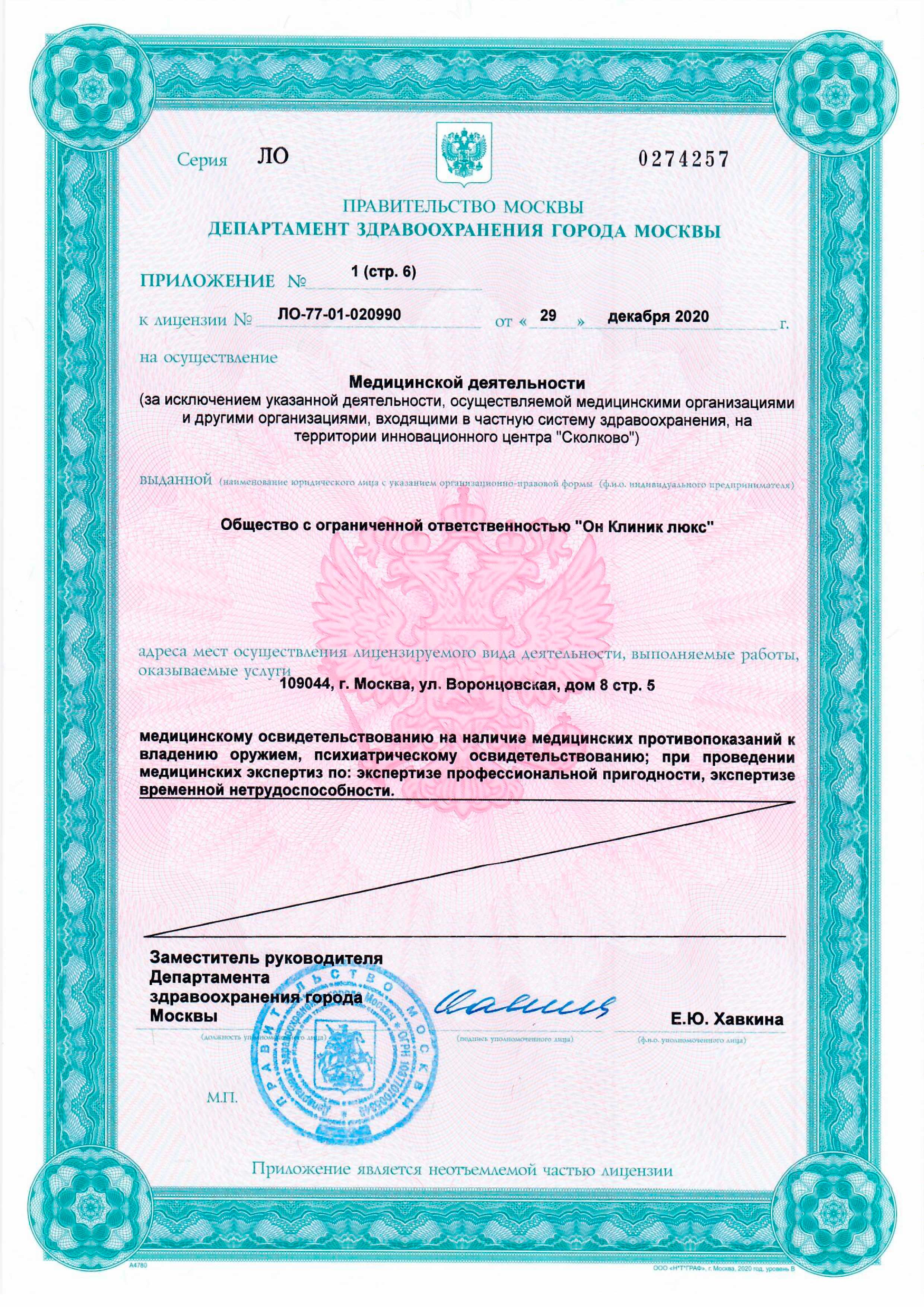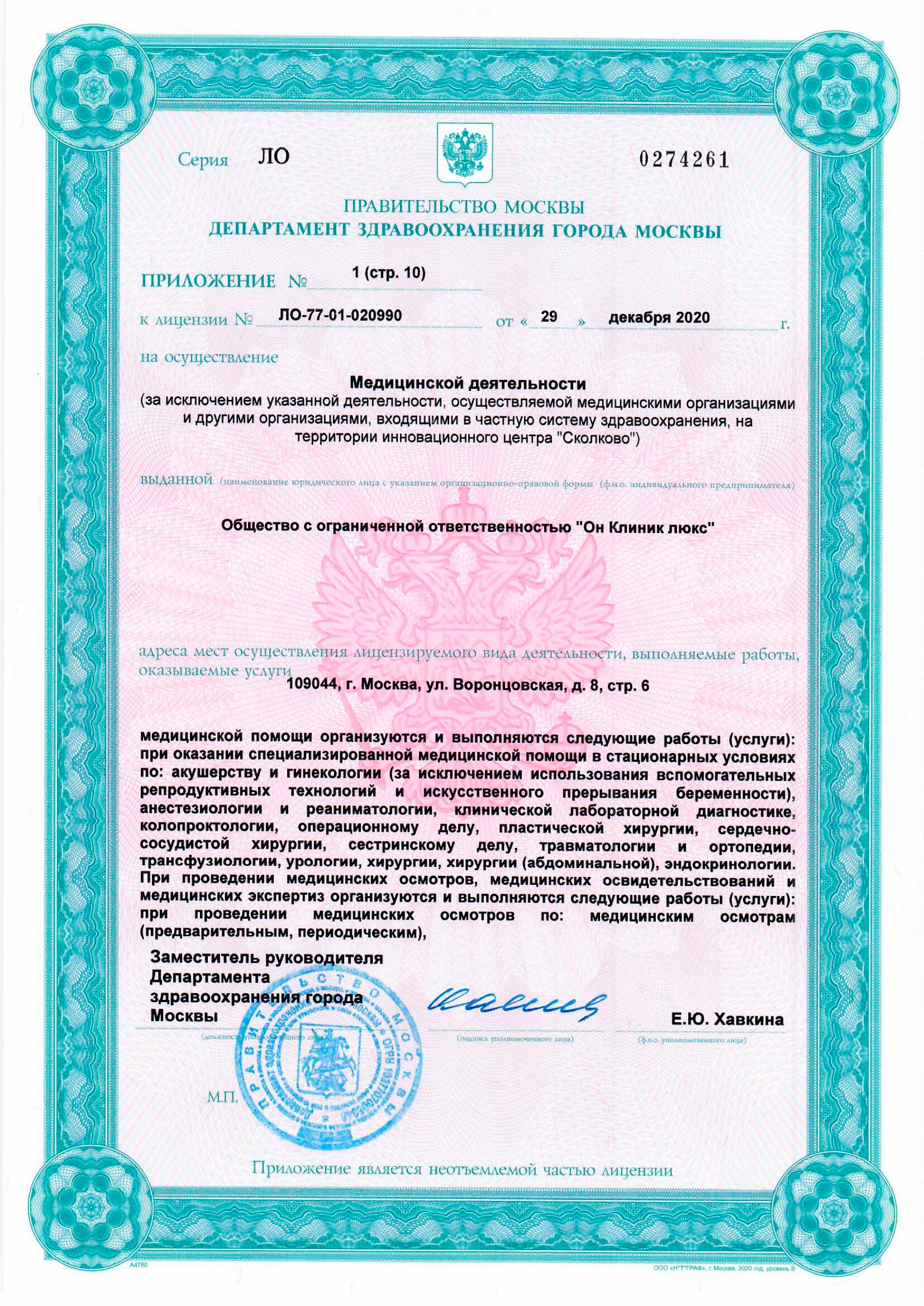 Лицензия ООО "Он Клиник люкс" ЛО-77-01-020990 от 29.12.20