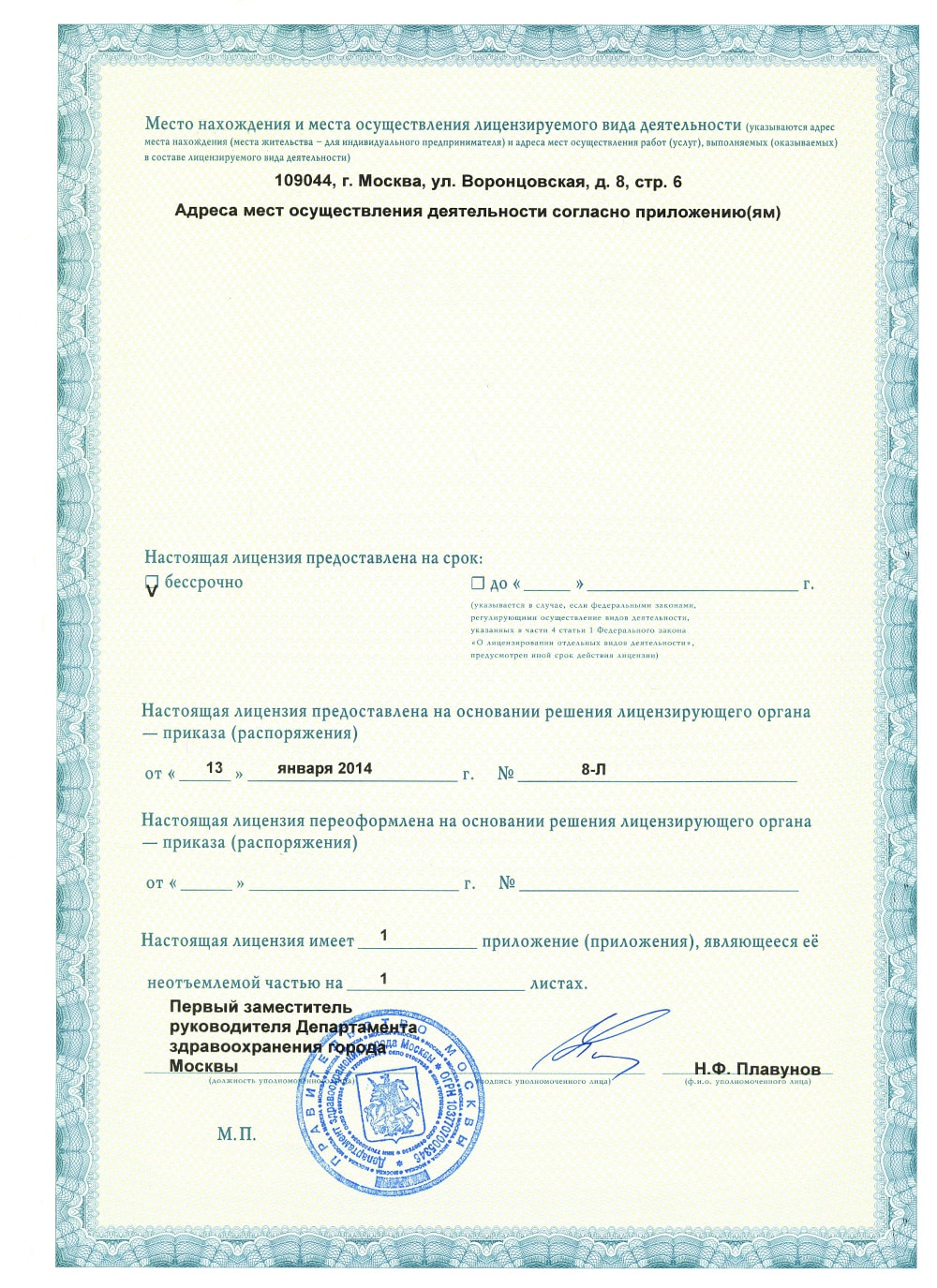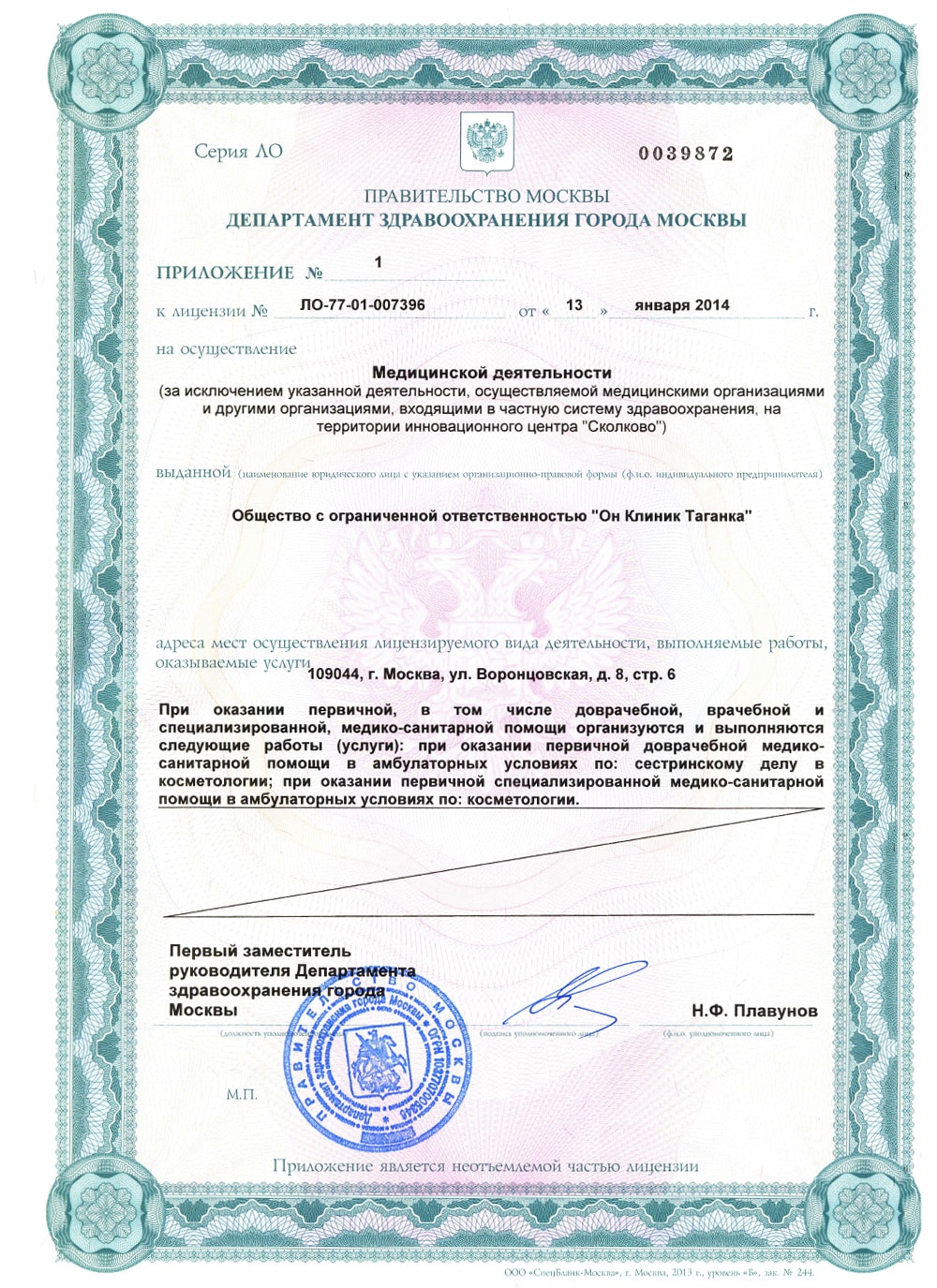 Лицензия ООО «Он Клиник Таганка» №ЛО-77-01-007396 от 13.01.14