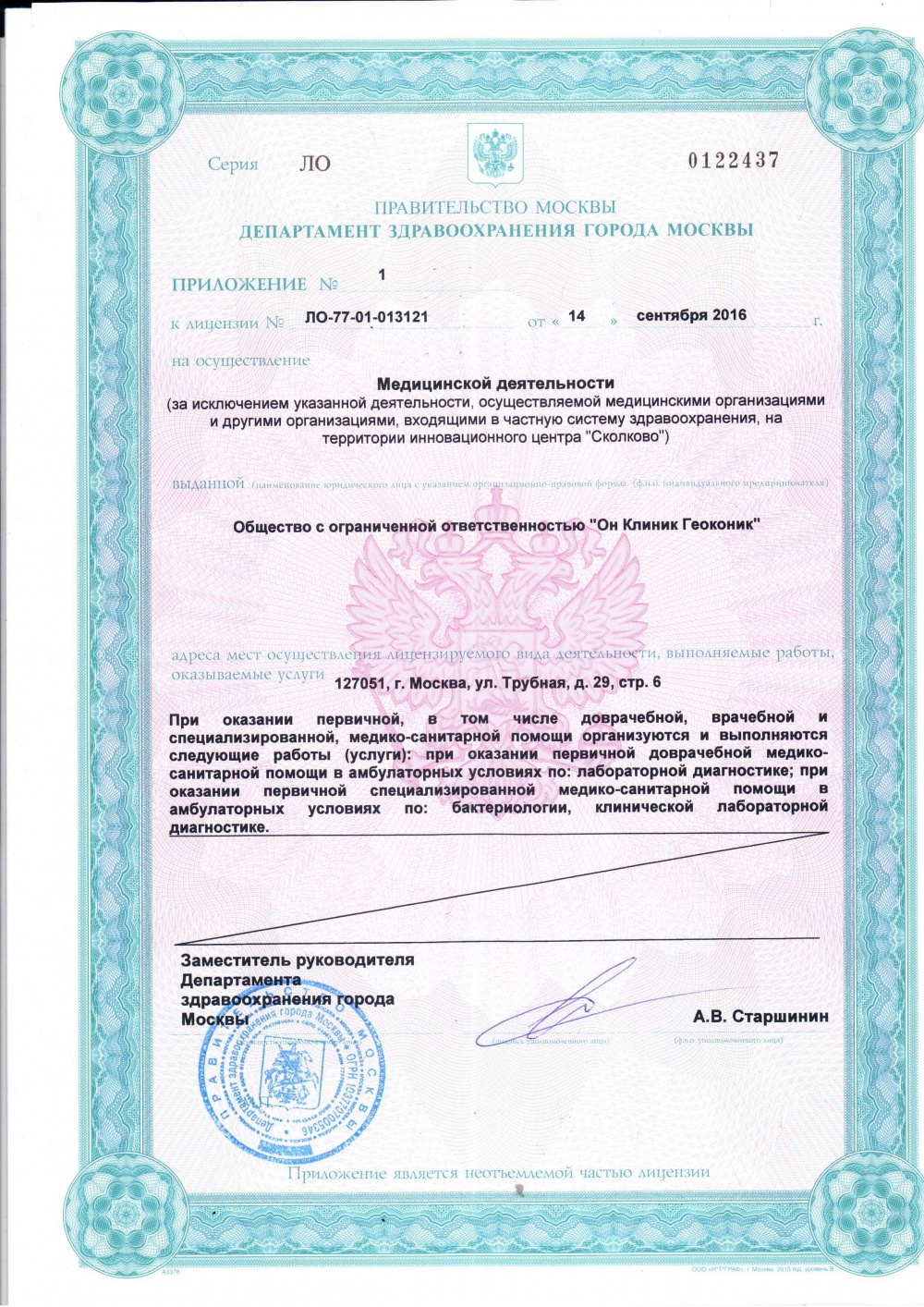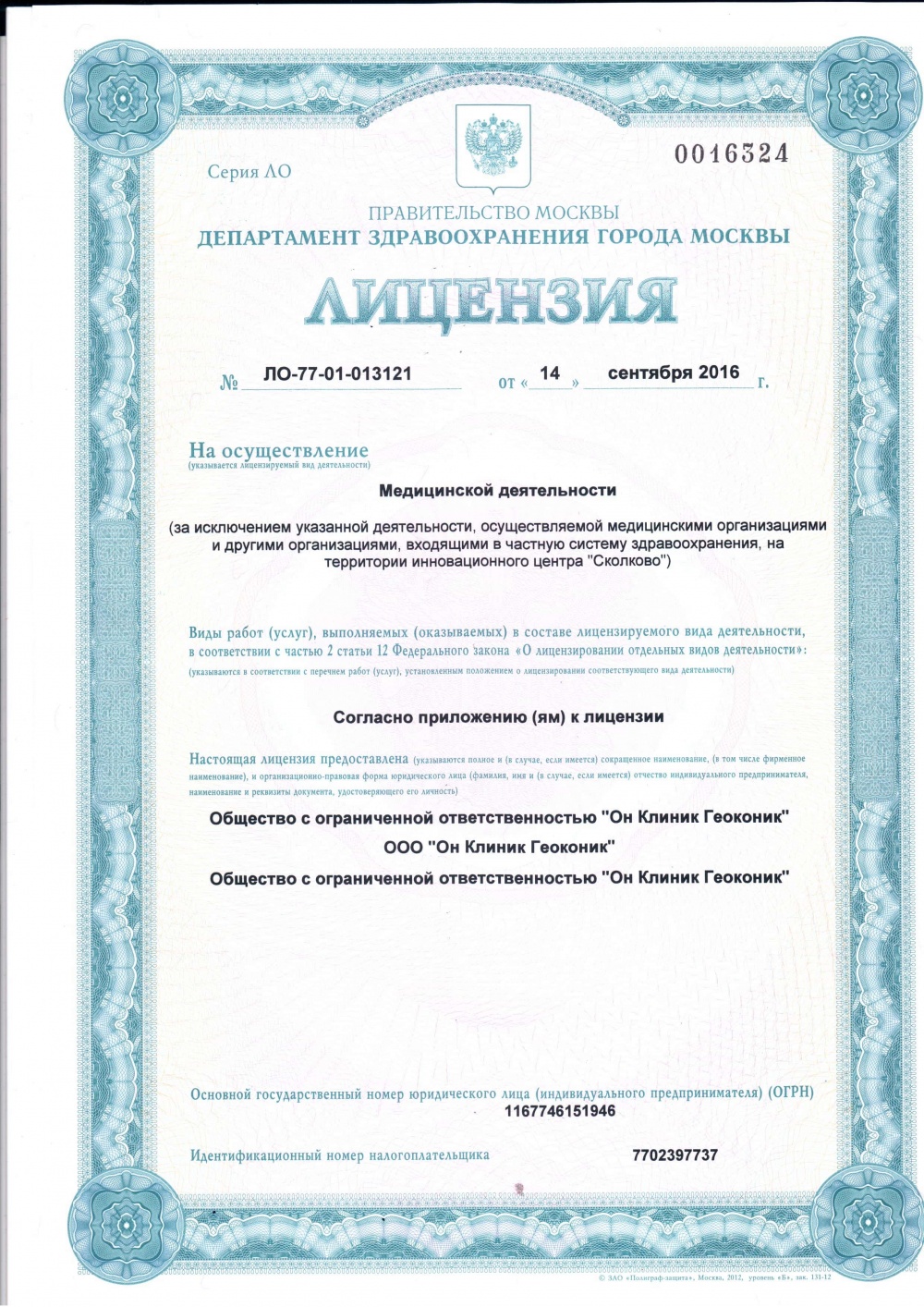 Лицензия ООО «Он Клиник Геоконик» №ЛО-77-01-013121 от 14.09.16