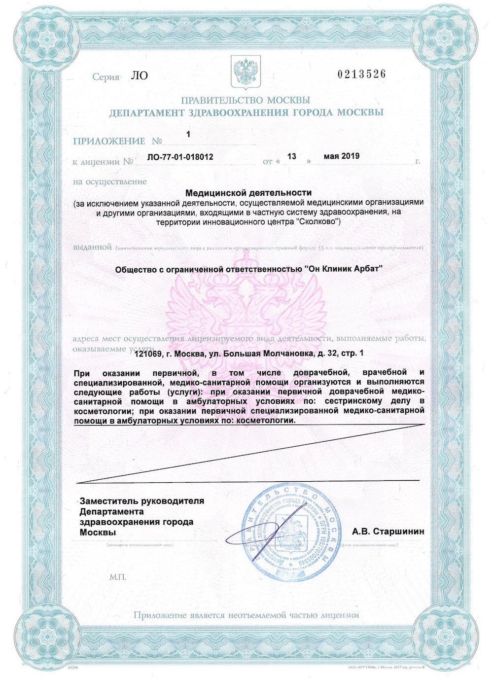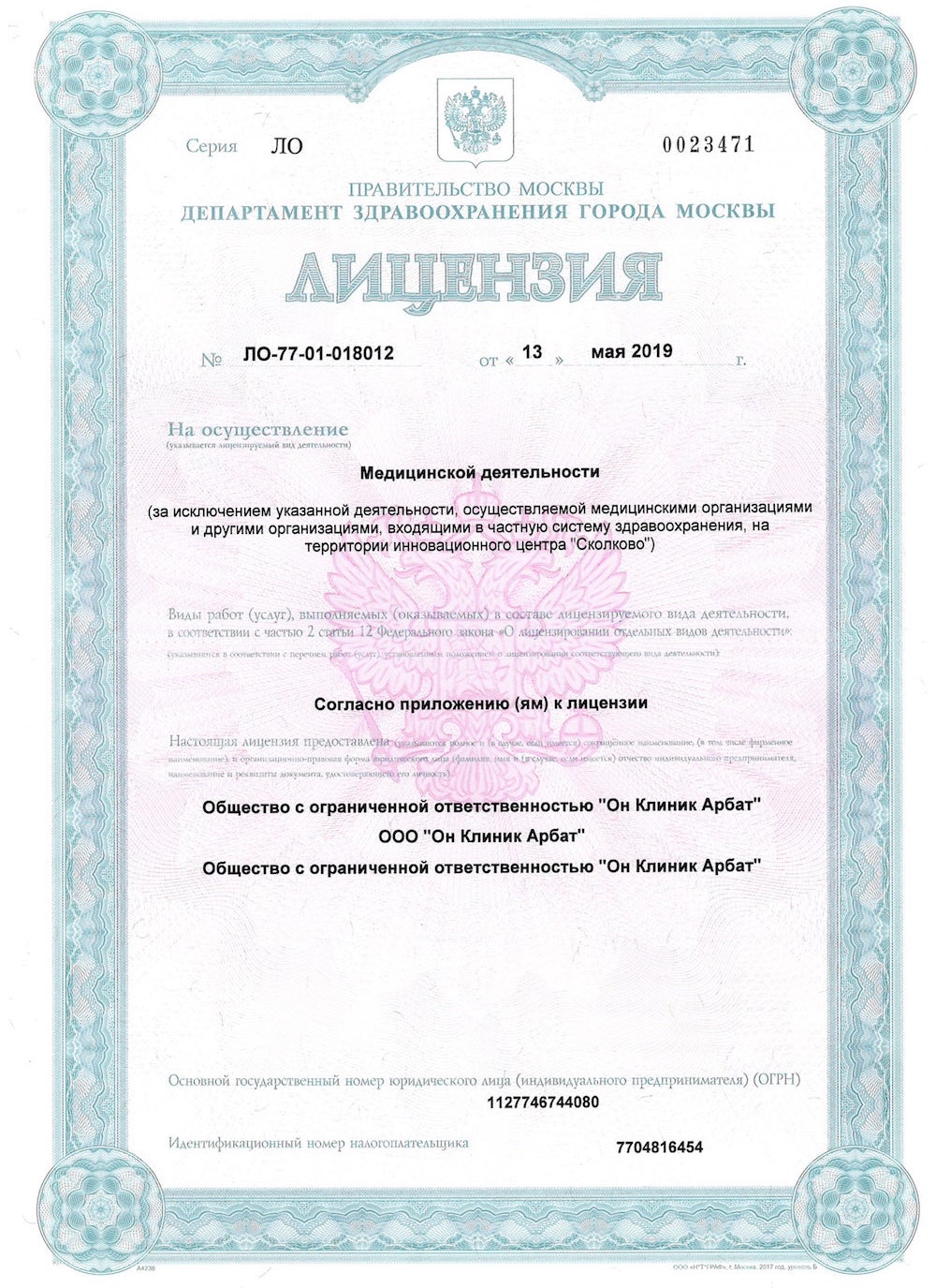 Лицензия ООО "Он Клиник Арбат" №ЛО-77-01-018012 от 13.05.19