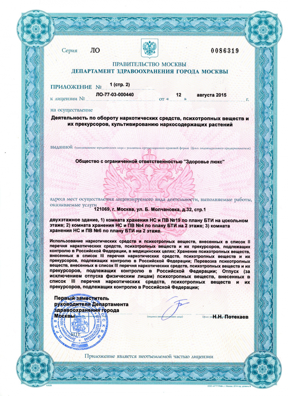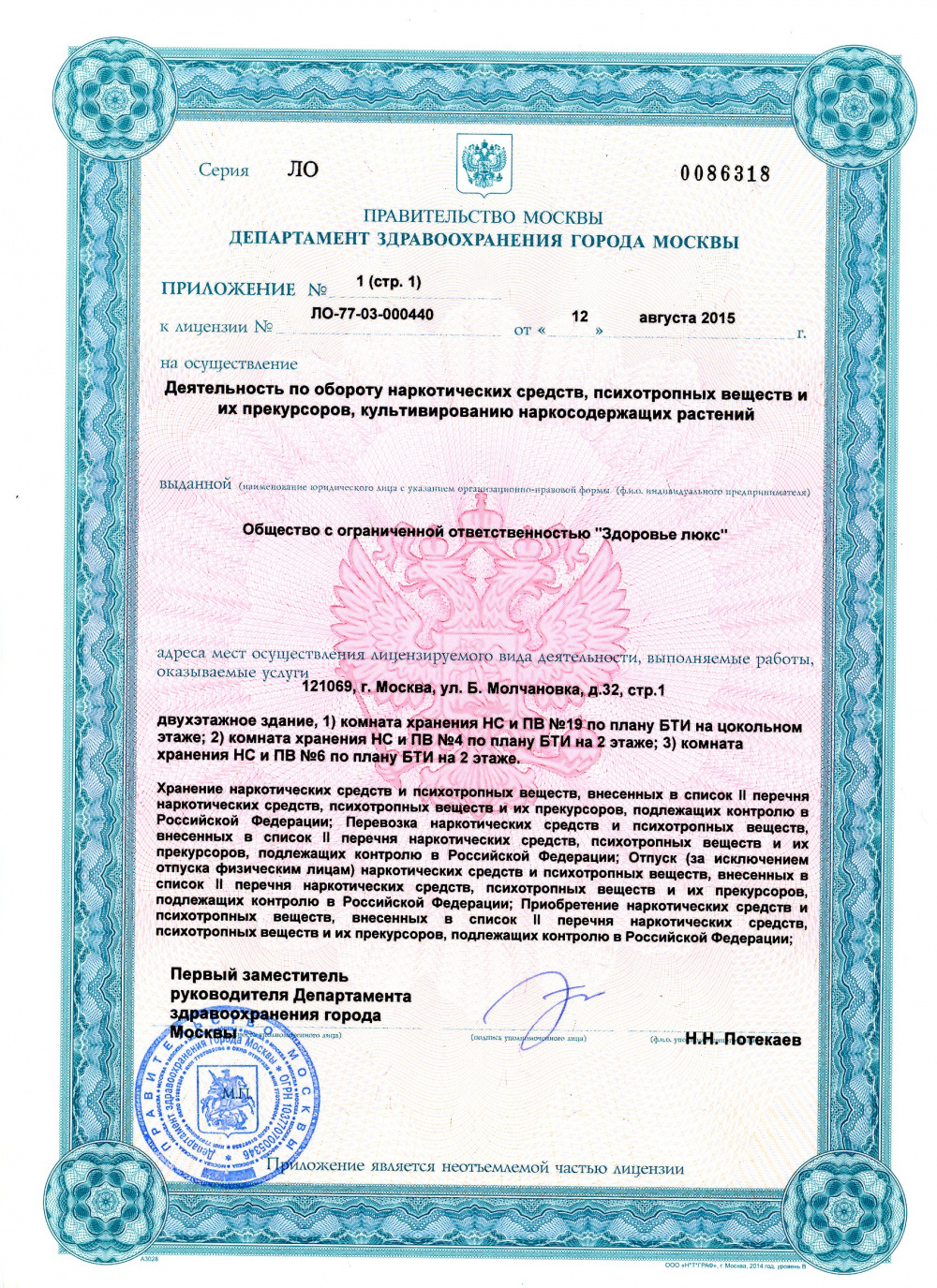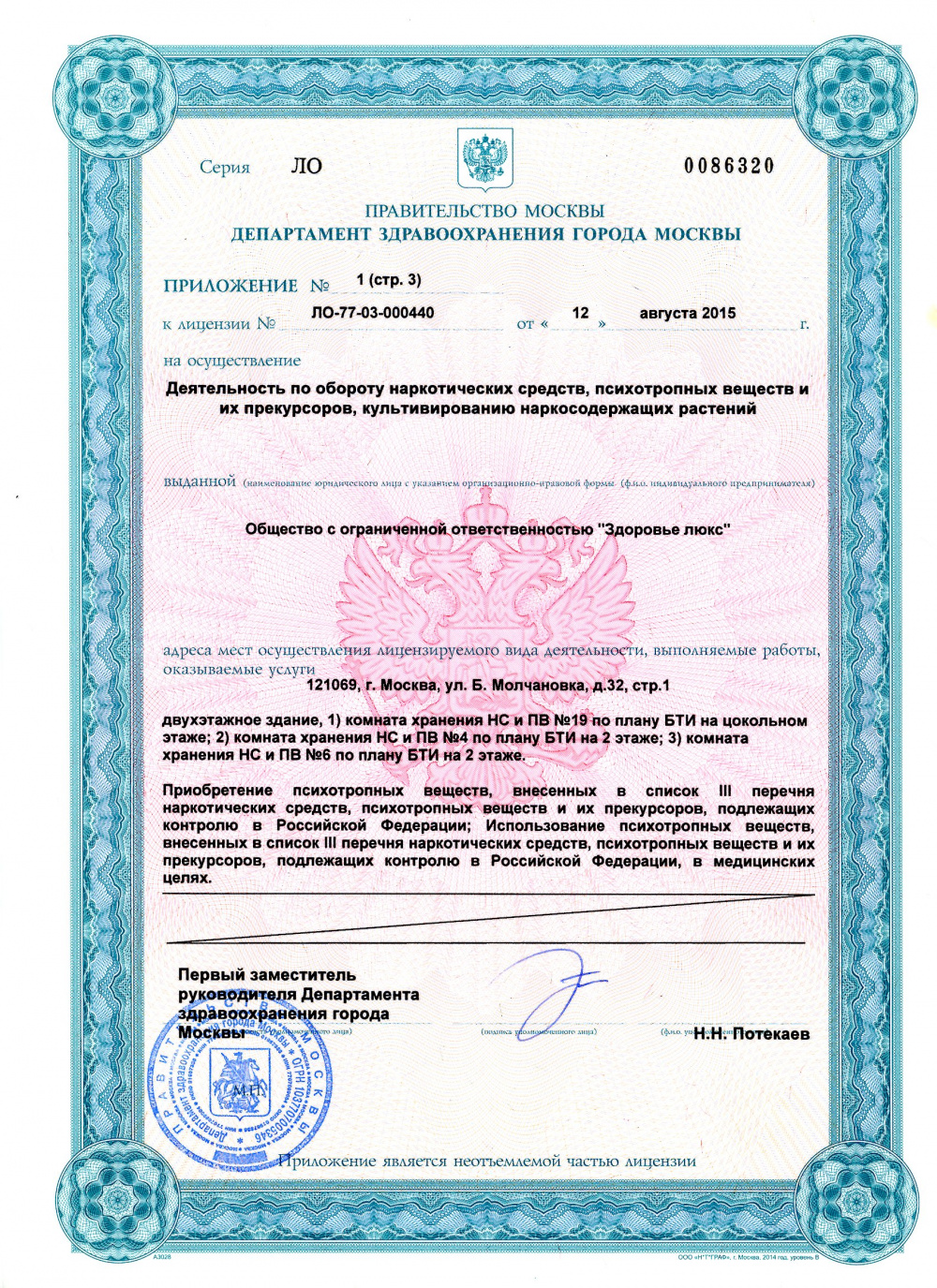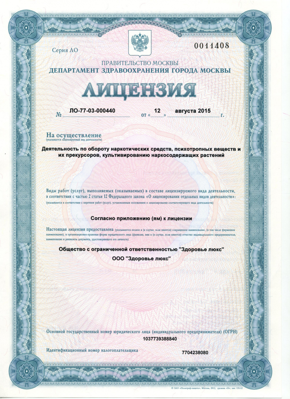Лицензия ООО "Здоровье люкс" №ЛО-77-03-000440 от 12.08.15