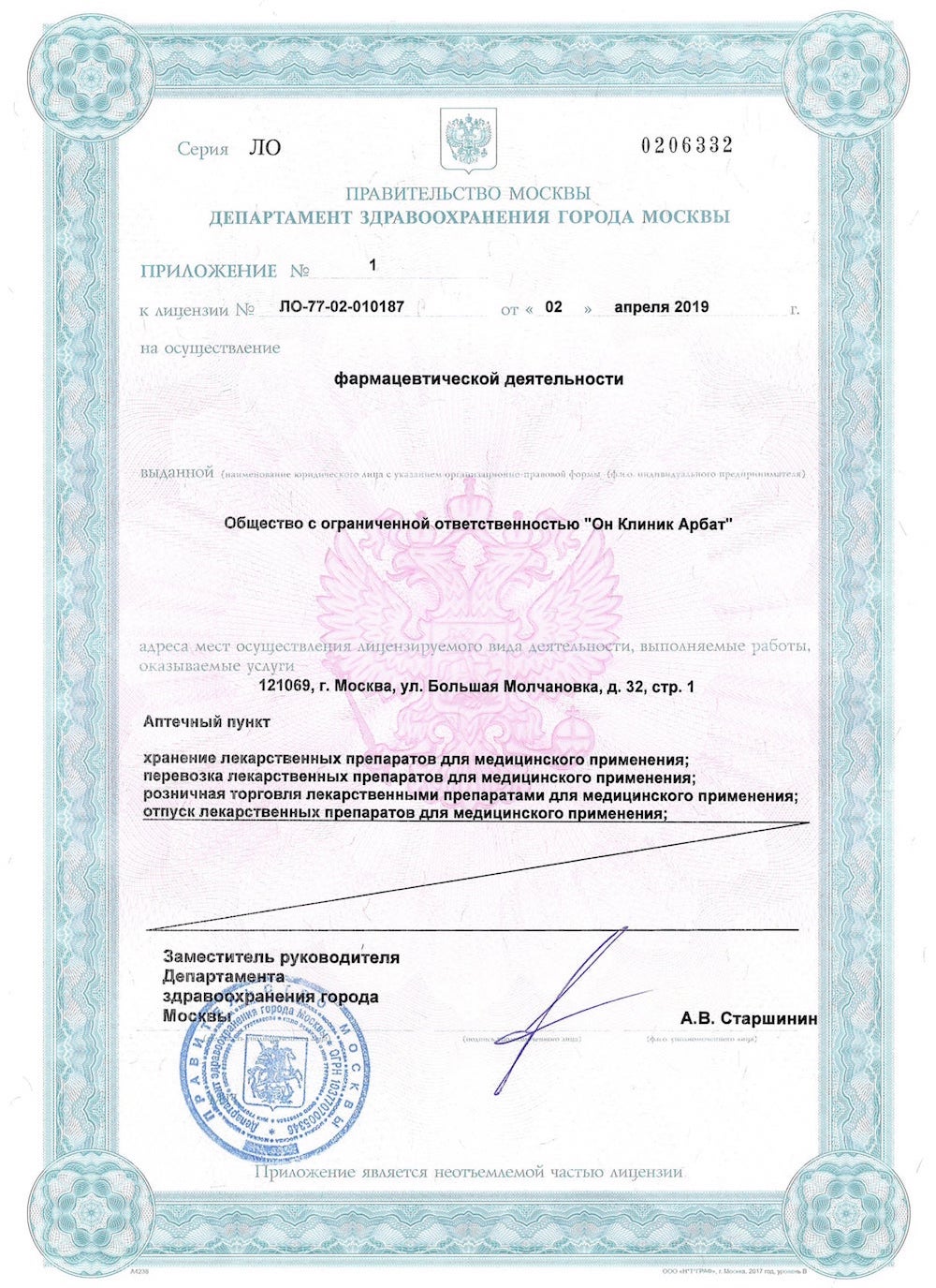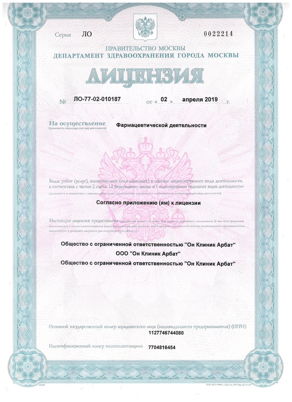 Лицензия ООО "Он Клиник Арбат" №ЛО-77-02-010187 от 02.04.19