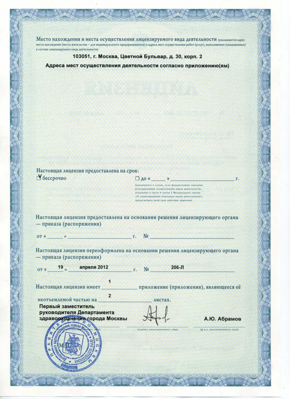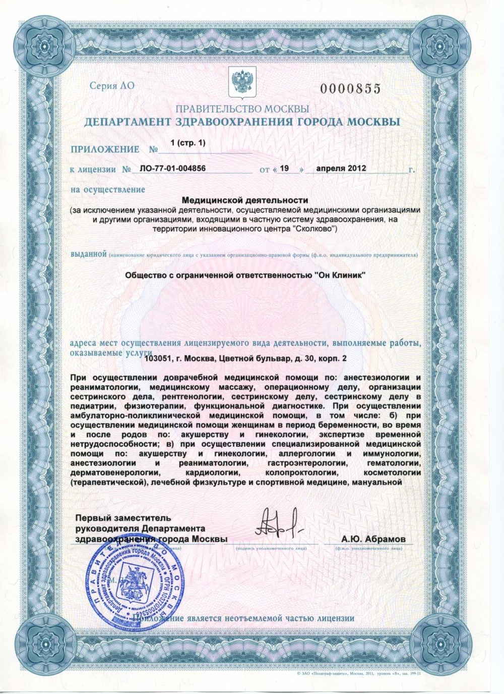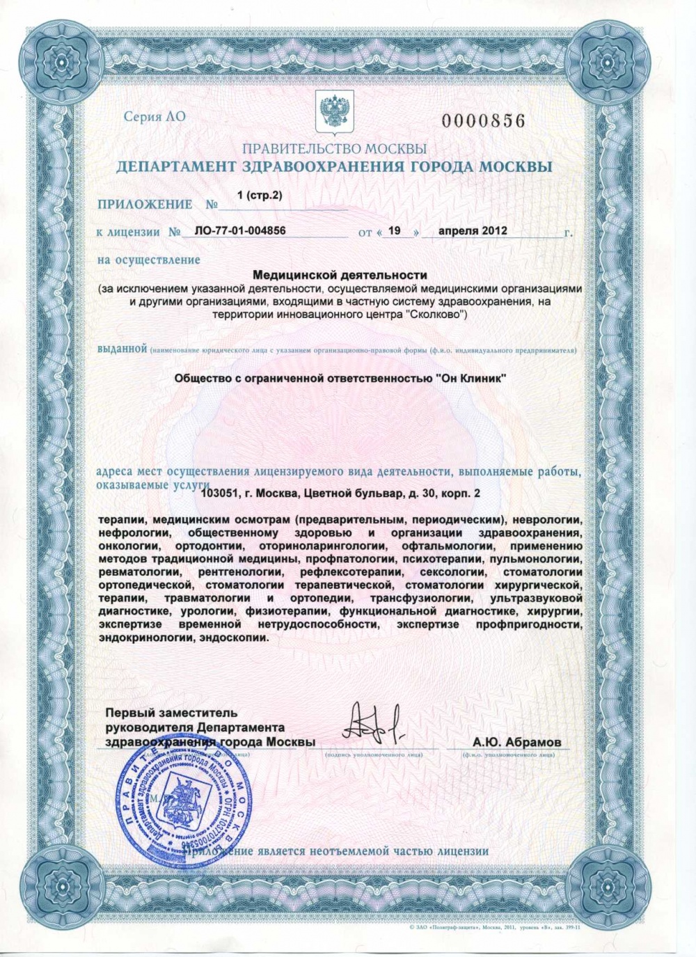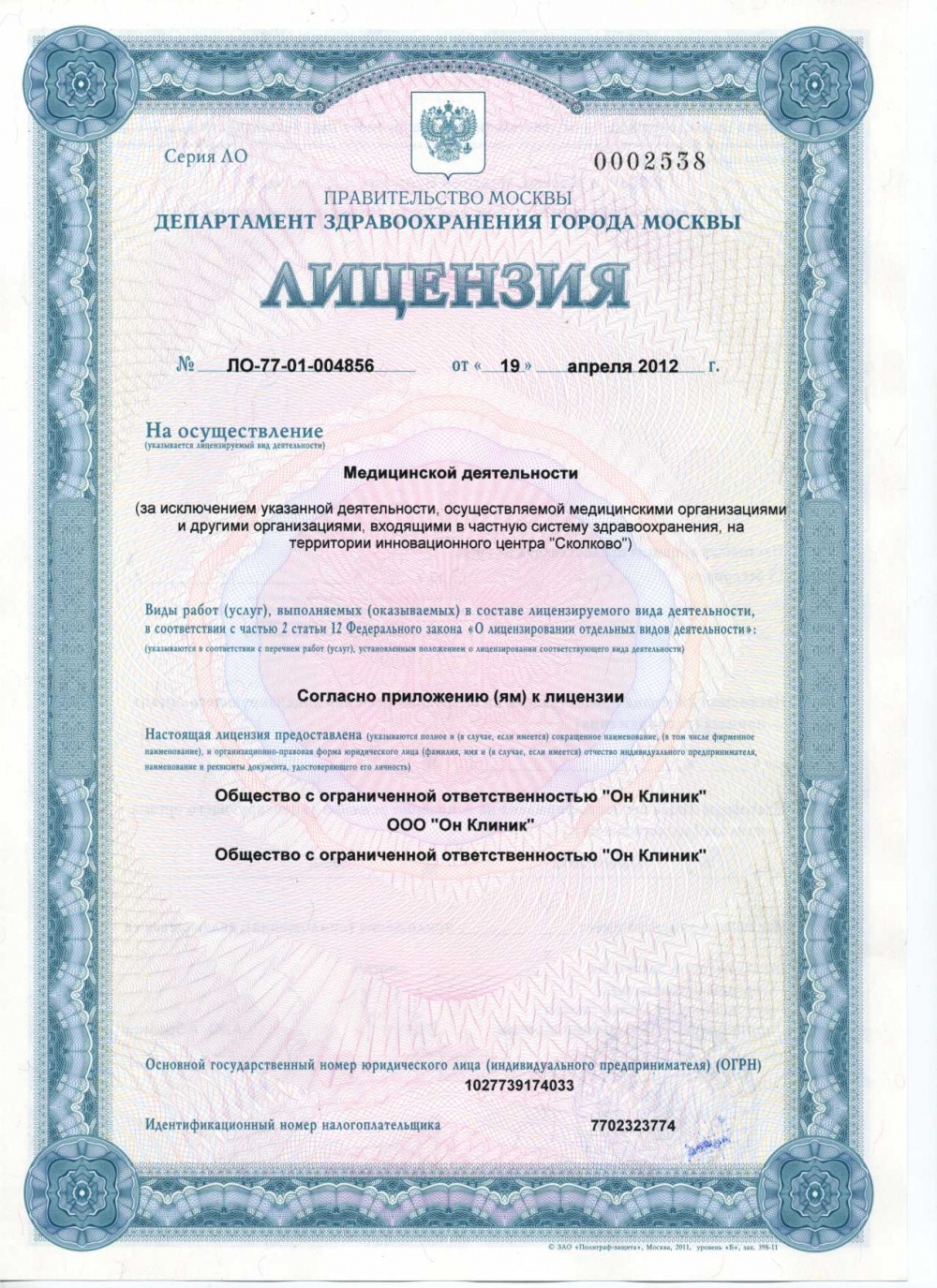 Лицензия ООО «Он Клиник» №ЛО-77-01-004856 от 19.04.12